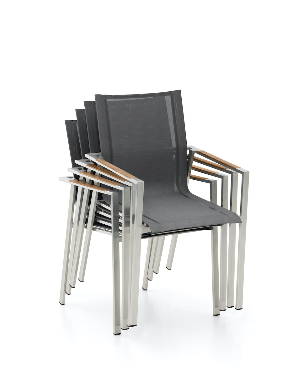 Moderná a zároveň elegantná záhradná stolička Genf je vytvorená z kvalitnej nerezovej ocele kombinovanej so vzdušnou a na dotyk veľmi príjemnou textíliou.